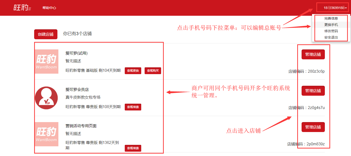 第二步,旺豹支持同个手机号码管理多个旺豹系统。点击手机号码下拉菜单,可以设置总账号。