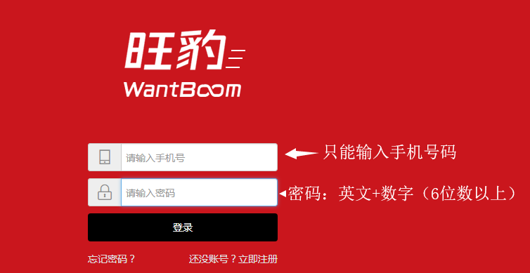 老商户请点击登录, 新商户烦请点击注册或者联系旺豹客服。