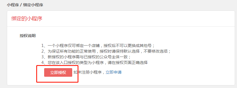 第二步,进入绑定小程序页面点击“立即授权”。