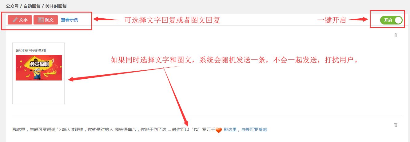 第二步,编辑用户关注时回复的文字或者图文,保存后点击“开启”按钮。
