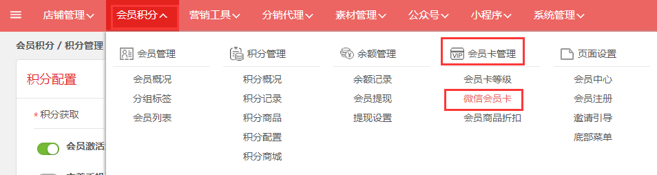 第一步,登入旺豹后台,点击“会员积分→会员卡管理→微信会员卡”。