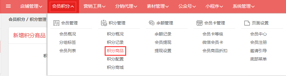 第一步,登入旺豹后台,点击“会员积分→积分商品”。