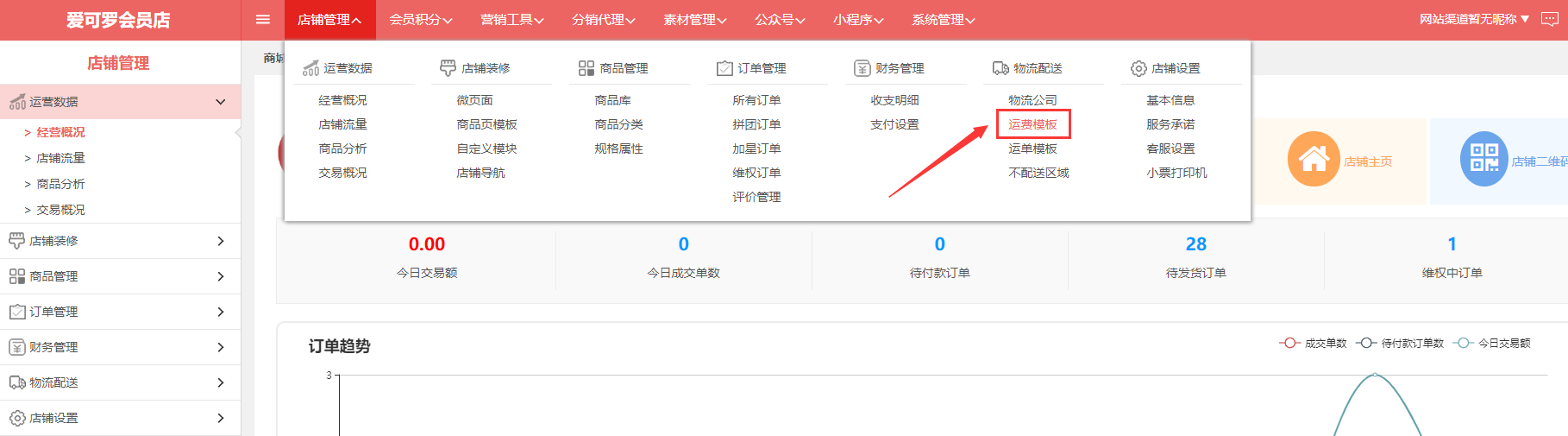 旺豹电脑端后台→店铺管理→运费模板