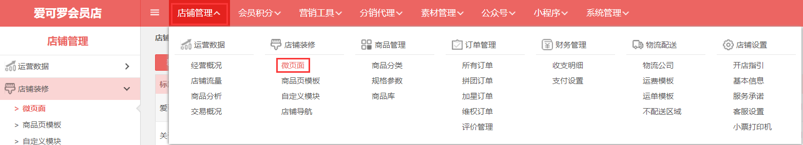 第一步,登入旺豹后台,点击“店铺管理→店铺装修→微页面”。