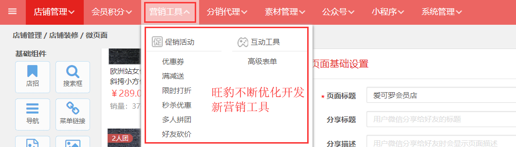 2)如果添加营销组件,需先到“营销工具”设置好活动商品,再回到微页面添加营销功能组件。建议先装修好店铺再设置活动商品。