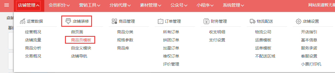 第一步,登入旺豹后台,点击“店铺管理→店铺装修→商品页模板”。