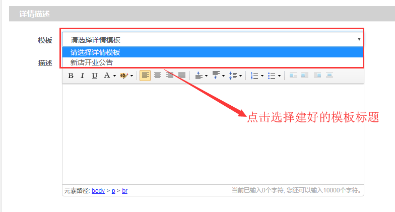 第四步,在“店铺管理→商品管理→商品库→添加商品”编辑商品的时候,商品详情描述选择建好的模板标题。