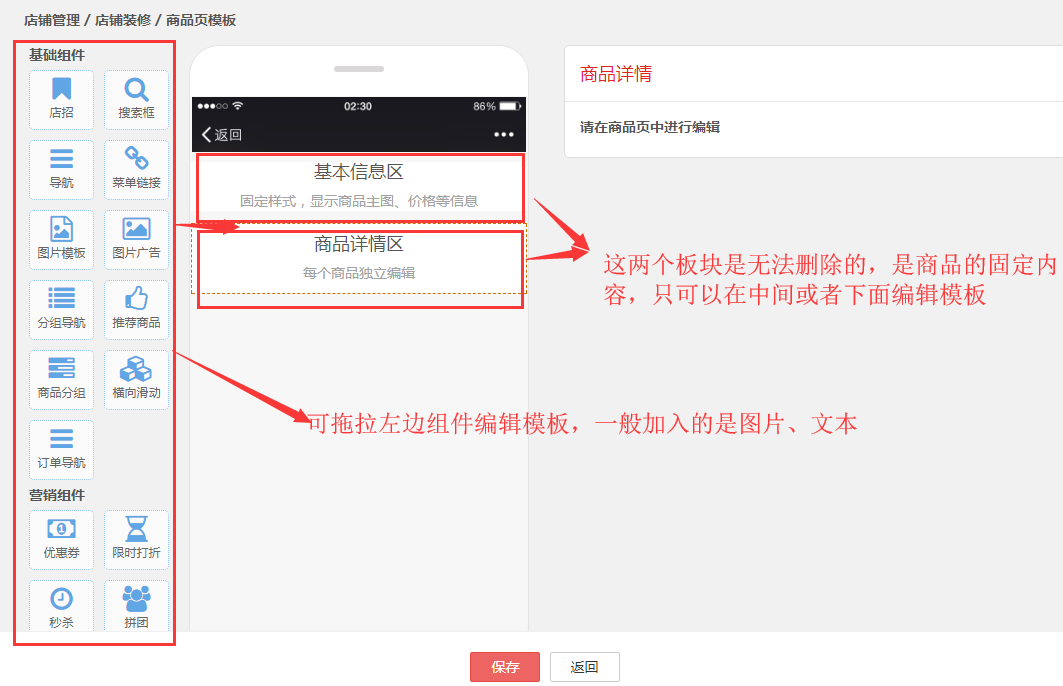 第三步,进入模板页面,可拖拉左边的组件到手机模拟框进行编辑。一般商品详情页需要加入的内容是图片或者文本。