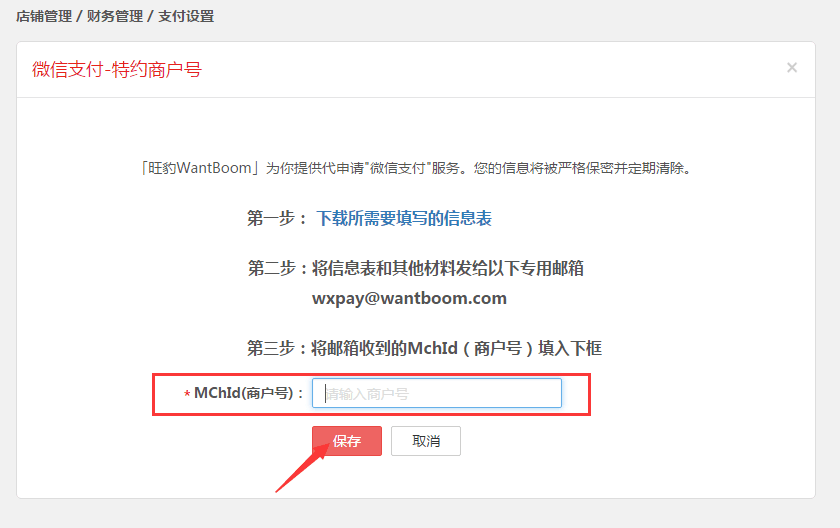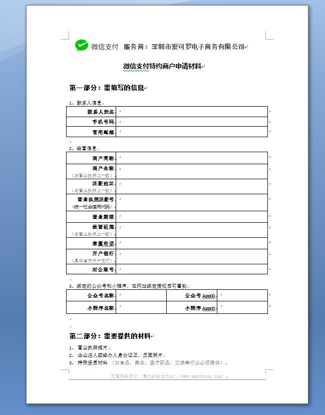 第二步,把填写完成的表格和需要的材料打包压缩发到旺豹邮箱:wxpay@wantboom.com