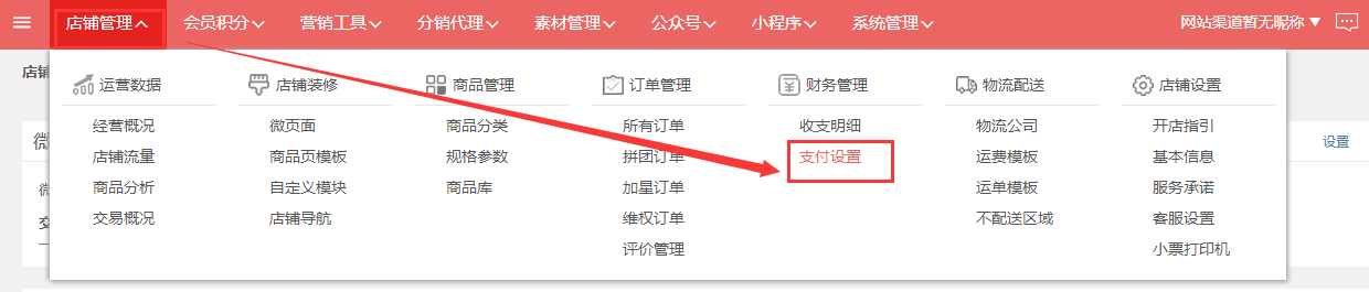 第一步,登入旺豹后台,点击“店铺管理→财务管理→支付设置”。