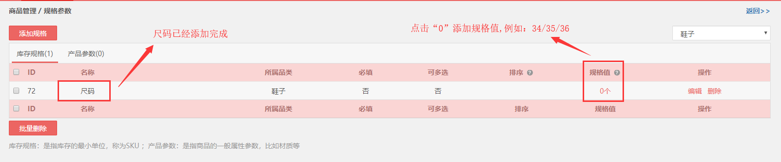 第四步, 添加完成的规格会显示在列表内,点击“0”添加规格值。例如尺码分为:34/35/36