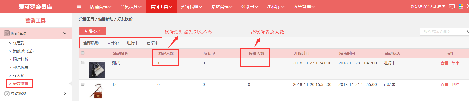 例如:活动结束时间设置为11月27日00:00:00,砍价有效期24小时,用户在11月27日23:59:59仍可发起砍价,但时间到达11月27日00:00:00,砍价活动结束;