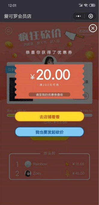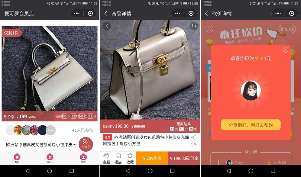 砍价,即用户选择心仪商品发起砍价活动,分享给多个好友后,通过好友的助力,使商品价格不断降低,当足够人数的好友助力砍价后,砍到商品最低价格(可以为0元)后,用户可以按照此价格下单,获得该商品。同时帮助该用户砍价的好友,看到此活动后,也可以发起砍价,邀请更多人参与到砍价活动中,帮砍者有优惠券奖励,完整实现粉丝裂变增长,并带动店铺销量。
