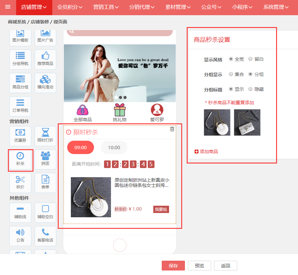 路径:店铺管理→微页面→添加“秒杀”组件→添加商品,如图所示: