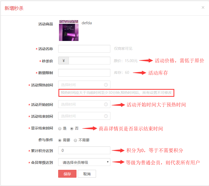 1)设置后不可修改,若需要提前结束活动,可点击“结束”。结束后不影响该活动未付款订单。