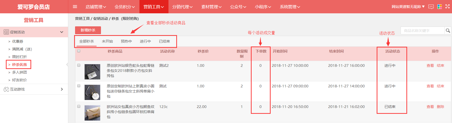 1)设置后不可修改,若需要提前结束活动,可点击“结束”。结束后不影响该活动未付款订单。