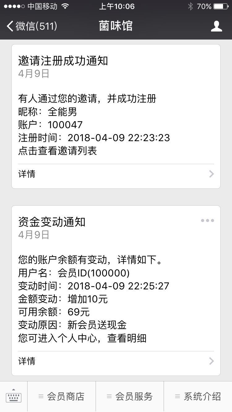 在你使用的过程,一定会遇到这么个情况,怎么给客户发系统消息,例如下图的积分变动情况: