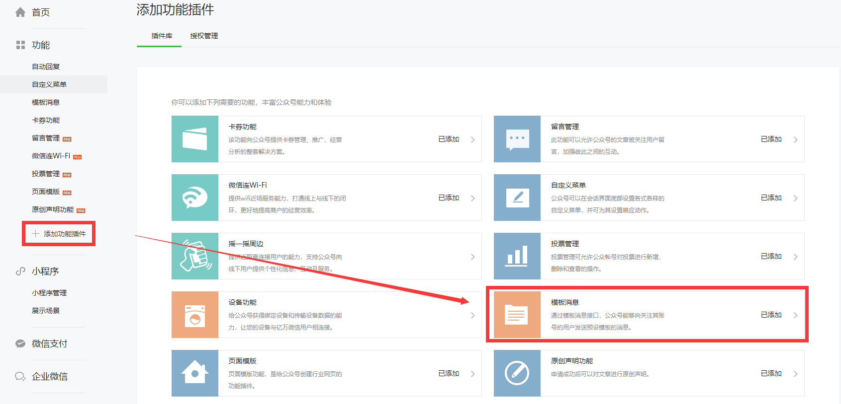第一步,登录你的微信公众号,点击左手边工具栏的“添加功能插件”,选择“模板消息”。