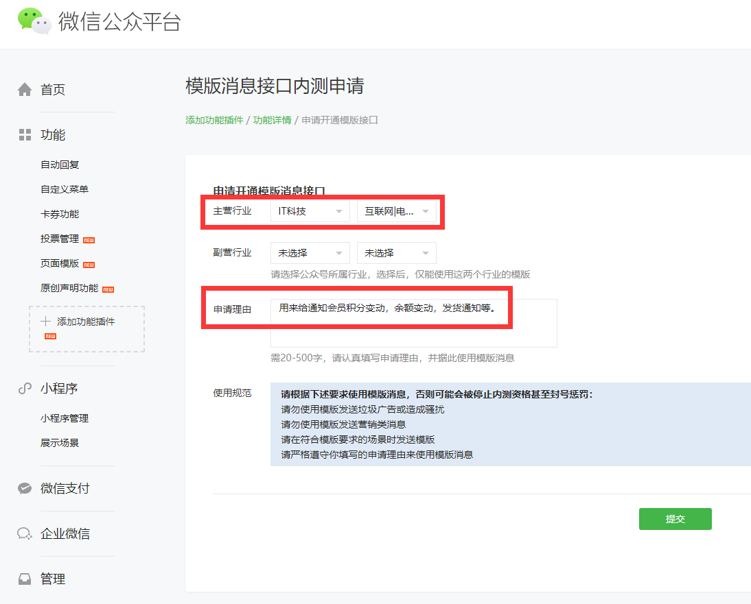 申请理由:用来给通知会员积分变动,余额变动,发货通知等。