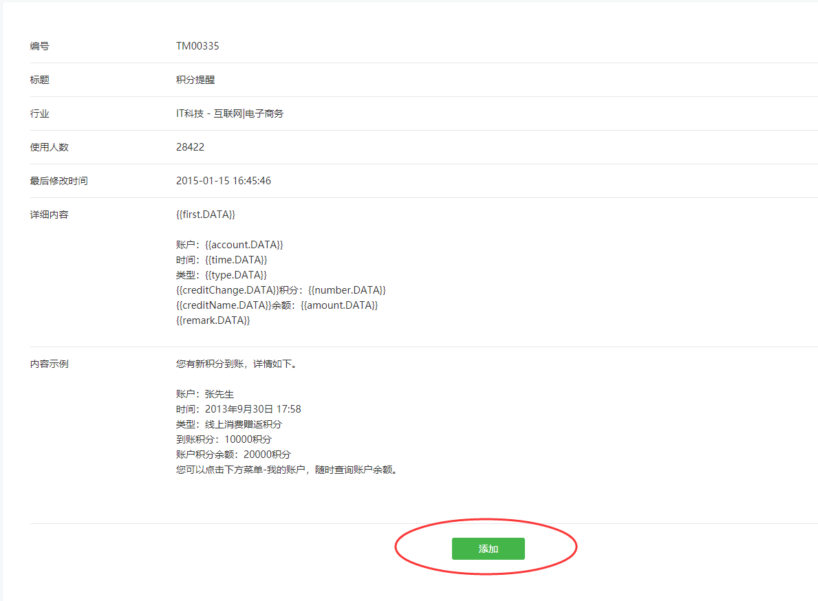 3)回到公众号模板消息,在搜索栏里搜索模板名称,选择编号与旺豹的唯一标识一致,点击最右边的详情。