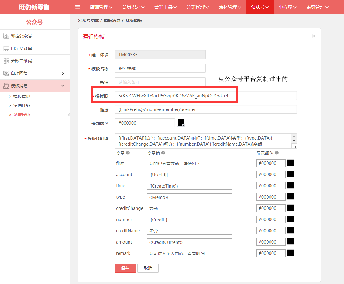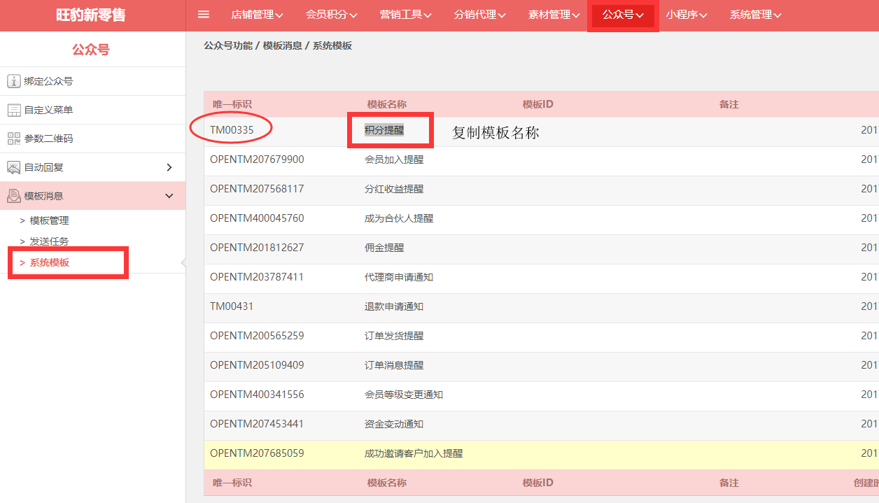 2)同时登入旺豹后台,“公众号”➜“系统模板”,复制模板名称,记住唯一标识。
