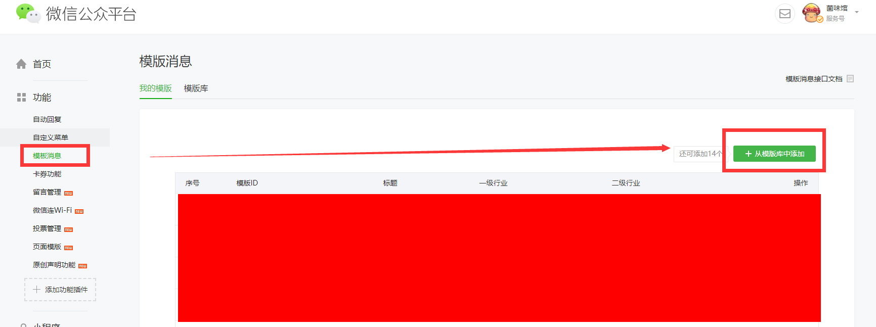 1)审核通过后,左手工具栏会出现“模板消息”一项,点击后,在右上角选择“+从模板库中添加”。