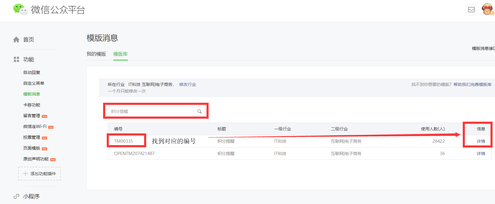 3)回到公众号模板消息,在搜索栏里搜索模板名称,选择编号与旺豹的唯一标识一致,点击最右边的详情。
