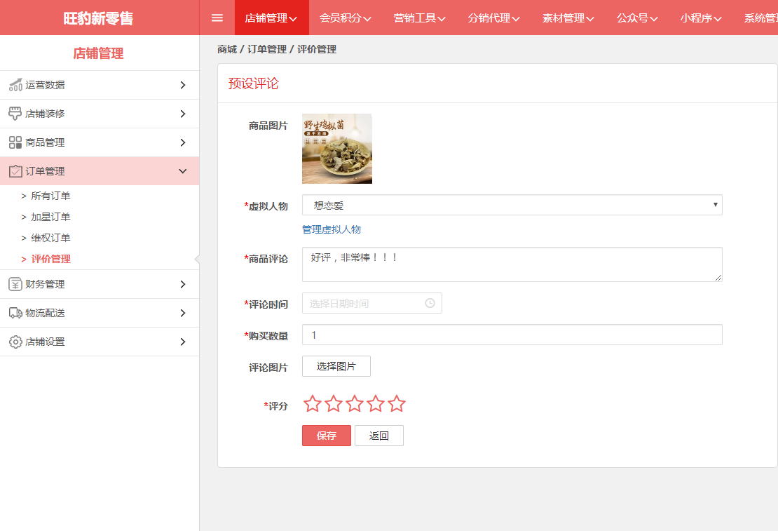 第一步,登入旺豹系统,点击店铺管理→商品管理→商品库,正在出售的商品可以增加虚拟评论,如图点击商品右手边的“预设评论”。