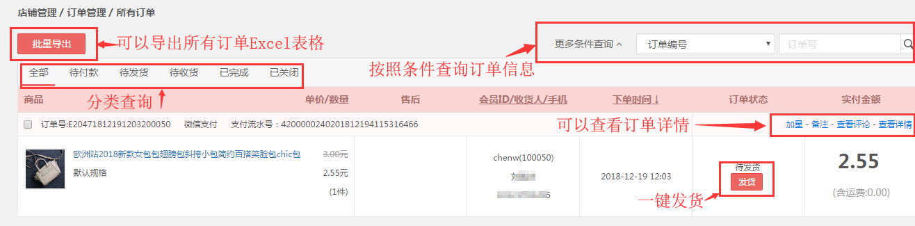 商户查看所有订单情况,并进行发货、备货、售后服务。