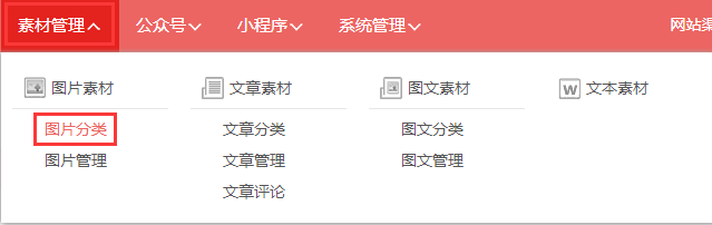 第一步,登入旺豹后台,点击“素材管理→图片分类”。