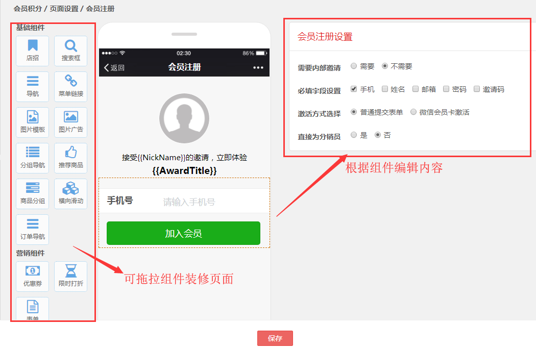 第二步,进入会员注册设置,旺豹默认设置用户填写手机号码,如无需更改保存即可。