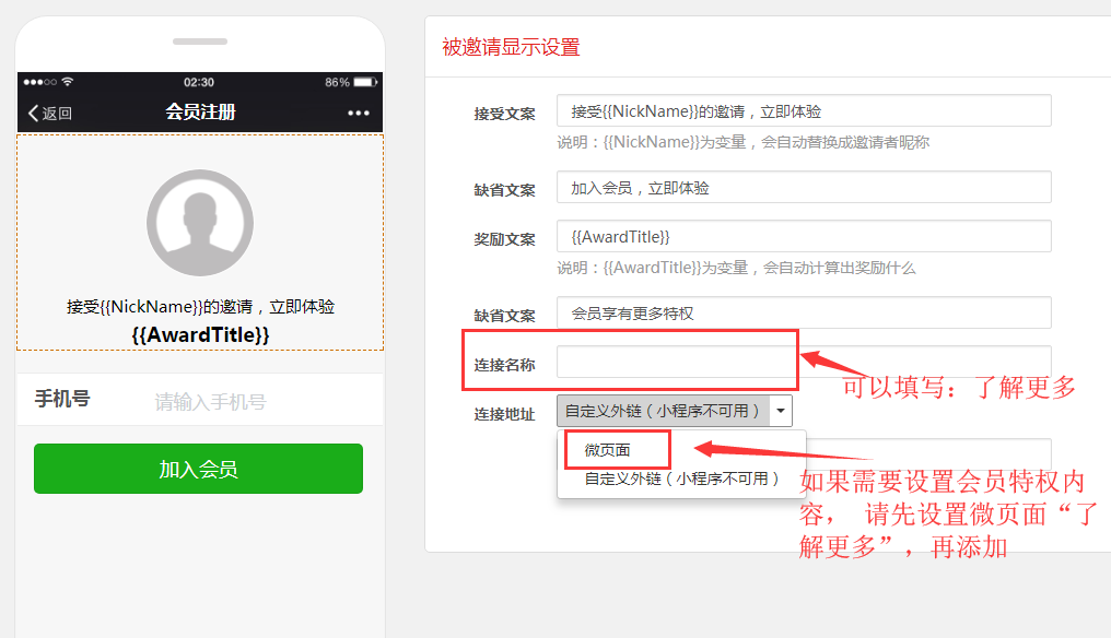 1)如果需要在会员注册页面,让用户了解到成为会员的相关权益,可以设置微页面,让用户点击跳转到微页面查看相关权益。