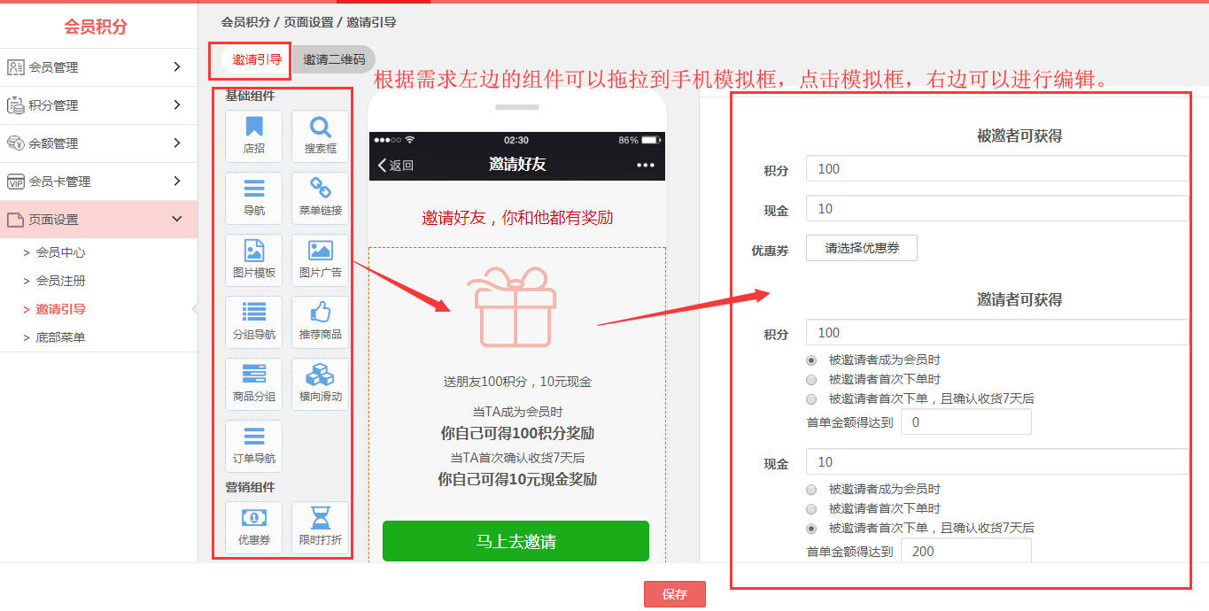 第二步,进入邀请引导页面,根据需求设计邀请页面,点击保存。