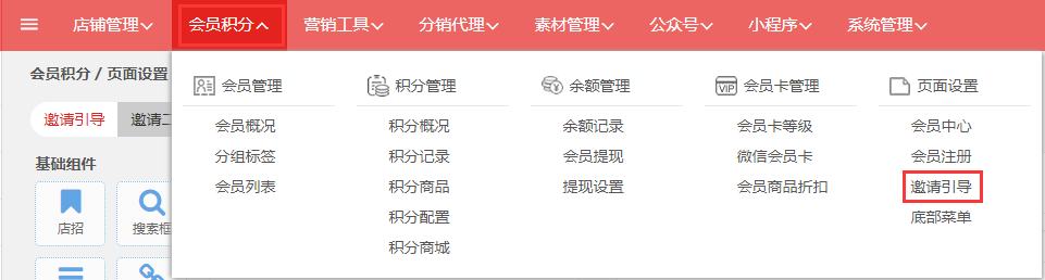 第一步,登入旺豹后台,点击“会员积分→邀请引导”。