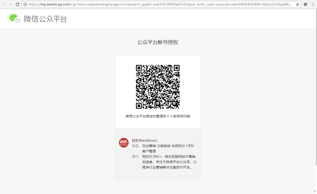 第三步,系统会自动跳转到微信公众平台,管理员个人微信号扫描二维码进行授权。