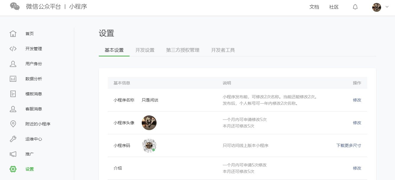注册成功后需要在设置中设置小程序的基本信息