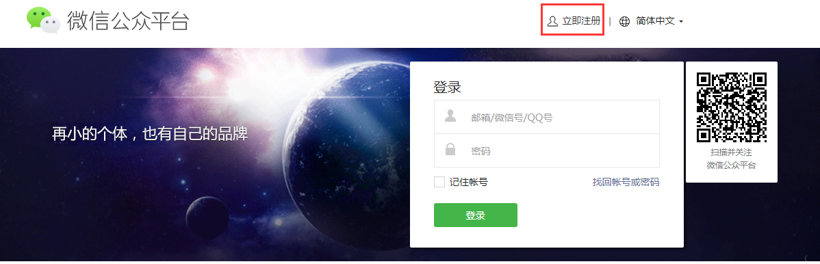 1、打开微信公众平台官网:https://mp.weixin.qq.com/ 右上角点击“立即注册”;